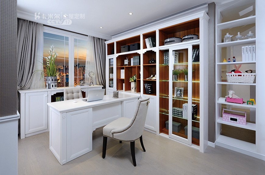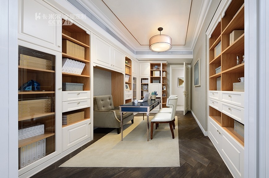 打造書房SOHO區(qū)書房采用白色和木紋拼色設(shè)計,開放展架可以擺放常看的書籍和裝飾品,封閉的柜體內(nèi)則可以用來收納雜物,搭配使用確保了書房的干凈整潔。在沿襲歐式的典雅風(fēng)格上,追求書房的舒適度與實用性。