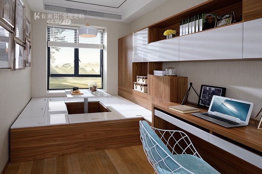 小空間,大利用根據(jù)戶型設(shè)計柜體,合理利用空間。帶儲物與桌子功能的榻榻米,與書桌書柜混搭組合。書房兼顧客房,有朋友過來還可以當(dāng)休閑區(qū)使用。小空間也能大利用!
