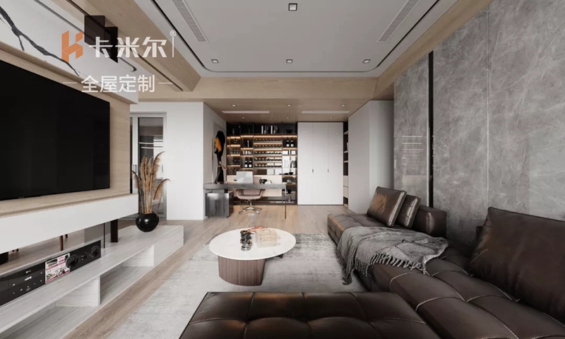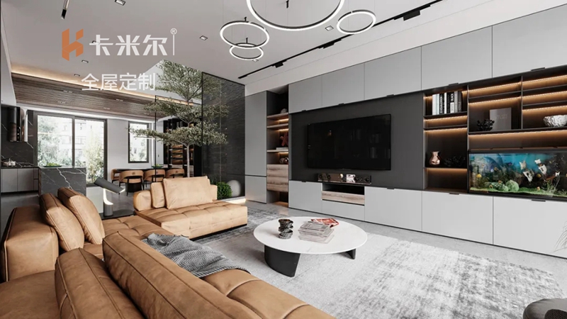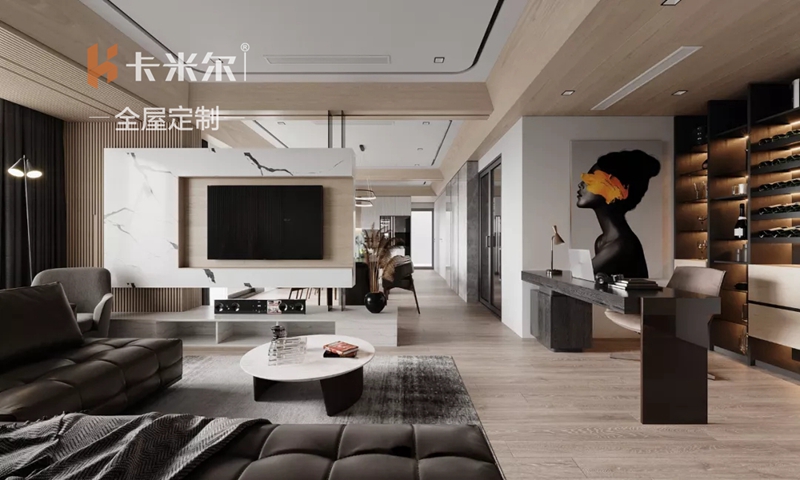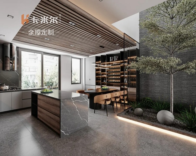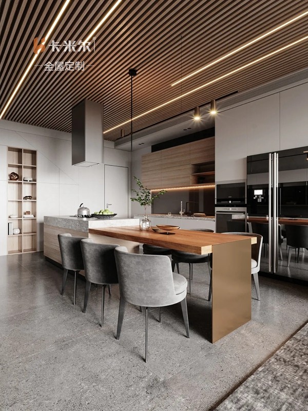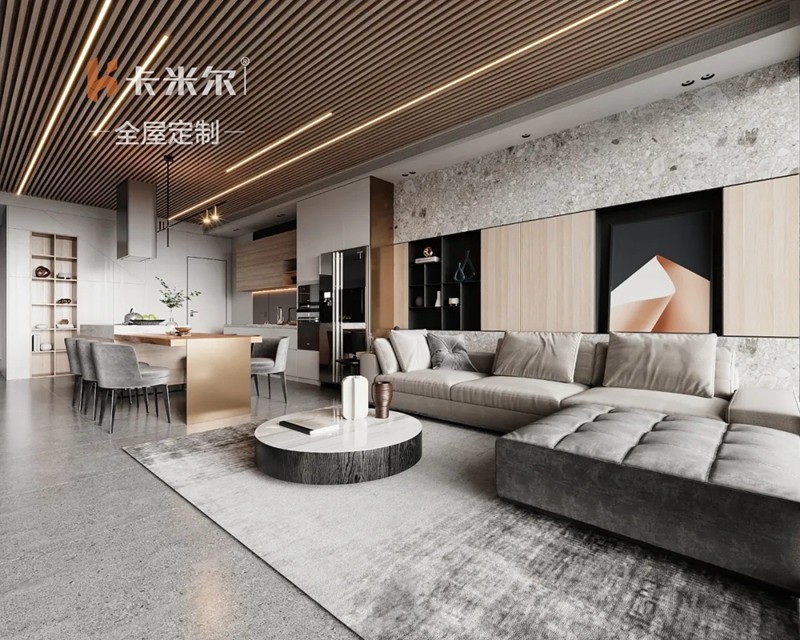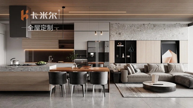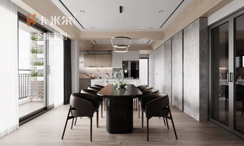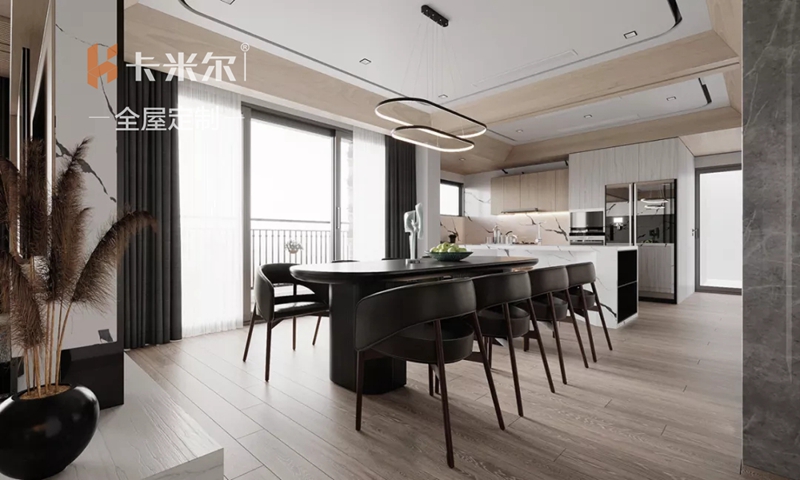 客廳和廚房餐廳是一體敞開式,打破常規(guī)布局,將固有的空間功能性釋放,這種開放式布局,適應(yīng)于當(dāng)代人們的生活方式,也創(chuàng)造了更多空間互動(dòng)性。