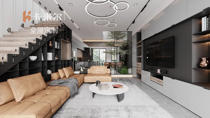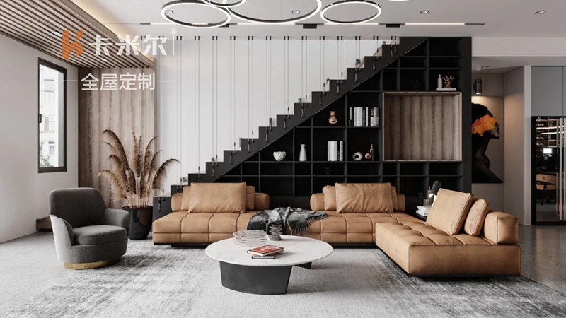 客廳的陳設(shè)考究至極,將樓梯下空間設(shè)計(jì)成展示柜,獨(dú)特的設(shè)計(jì)將空間巧妙運(yùn)用,功能和美學(xué)相得益彰。大面積的高級(jí)灰基調(diào)鋪設(shè),簡約又時(shí)尚,棕色皮質(zhì)沙發(fā)倚放在黑色書柜之前,打造出整個(gè)客廳的溫度,極具空間感染力。