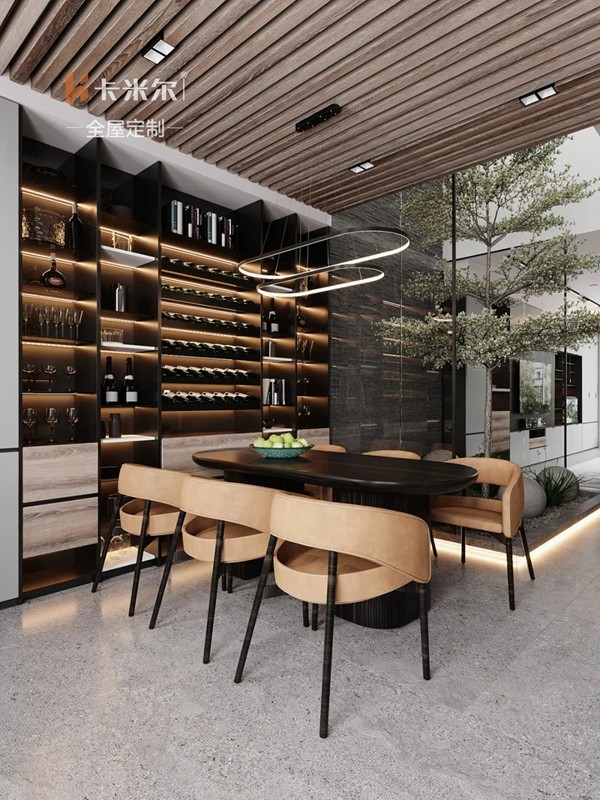 木制餐桌搭配棕色皮質(zhì)餐椅,木質(zhì)酒柜搭配玻璃隔層,木質(zhì)吊頂搭配黑色金屬吊燈,精心的材質(zhì)搭配,將空間質(zhì)感升華,也是對(duì)生活品質(zhì)的追求。