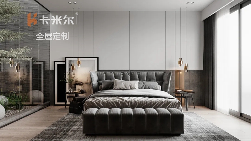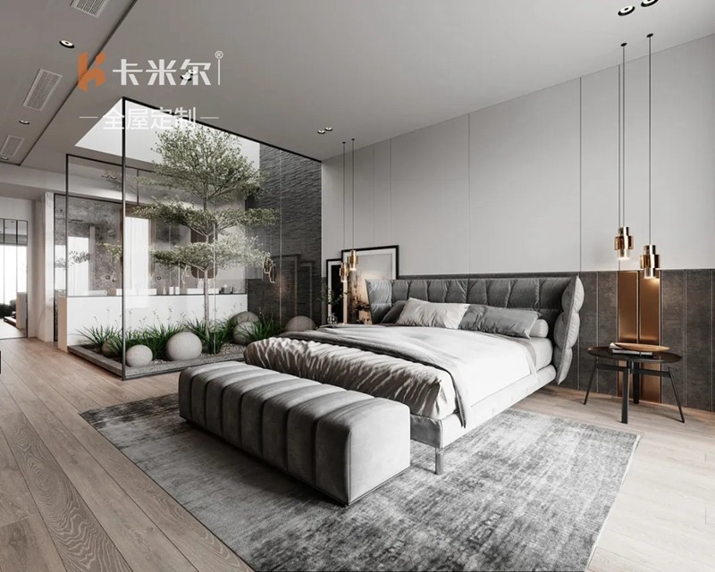 臥室套間,灰白色基調(diào)簡潔明亮,落地玻璃窗設(shè)計(jì)視覺感極佳,也將整個(gè)空間置于自然之光中,線性的吊燈低垂床的兩方,裝飾感極強(qiáng)。洗浴臺(tái)灰色大理石臺(tái)面,玻璃趟門衣柜,時(shí)尚大氣!