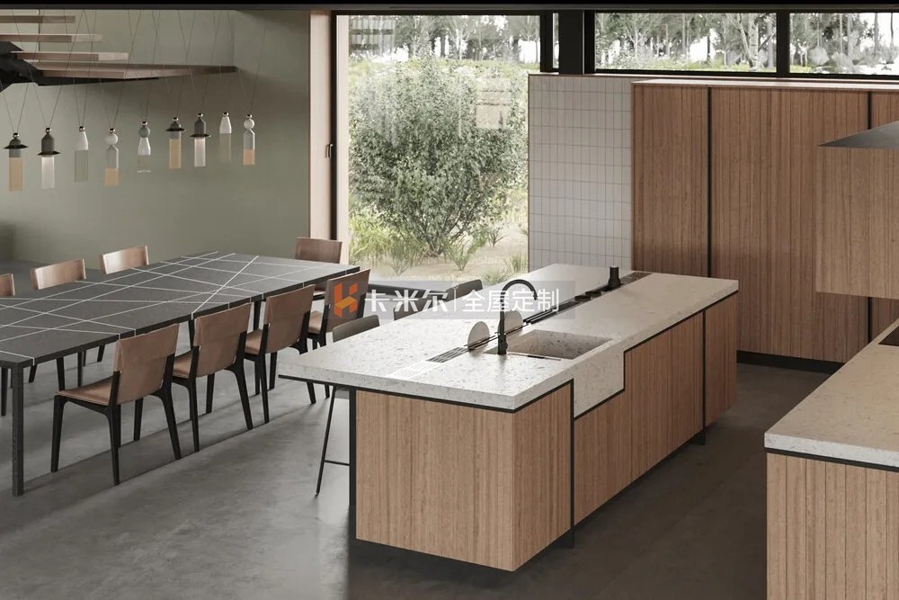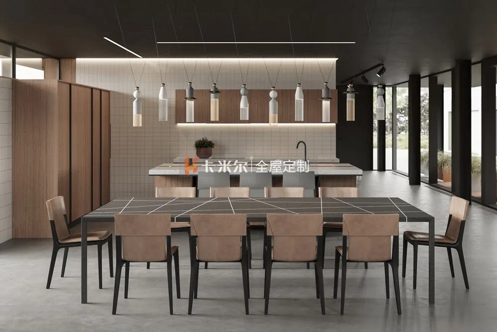 島臺(tái)+開放式廚柜,柜門創(chuàng)造性空間中融入時(shí)尚直線條構(gòu)筑的幾何造型,讓新中式耳目一新。