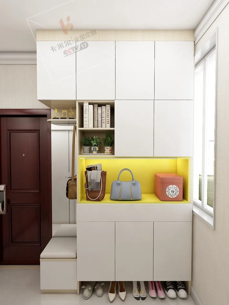 一整面墻的木柜,大大小小的格子,收納很方便。回家后可以把衣服、鞋子和包放在這里。平時要用的一些工具也都可放在這里,方便拿取。